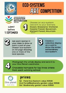 One Planet South Africa (KwaZulu-Natal) invites learners and young creatives to take part in their Ecosystem Art Competition. A chance to express your creativity while raising awareness about the urgent need to restore our planet’s ecosystems.